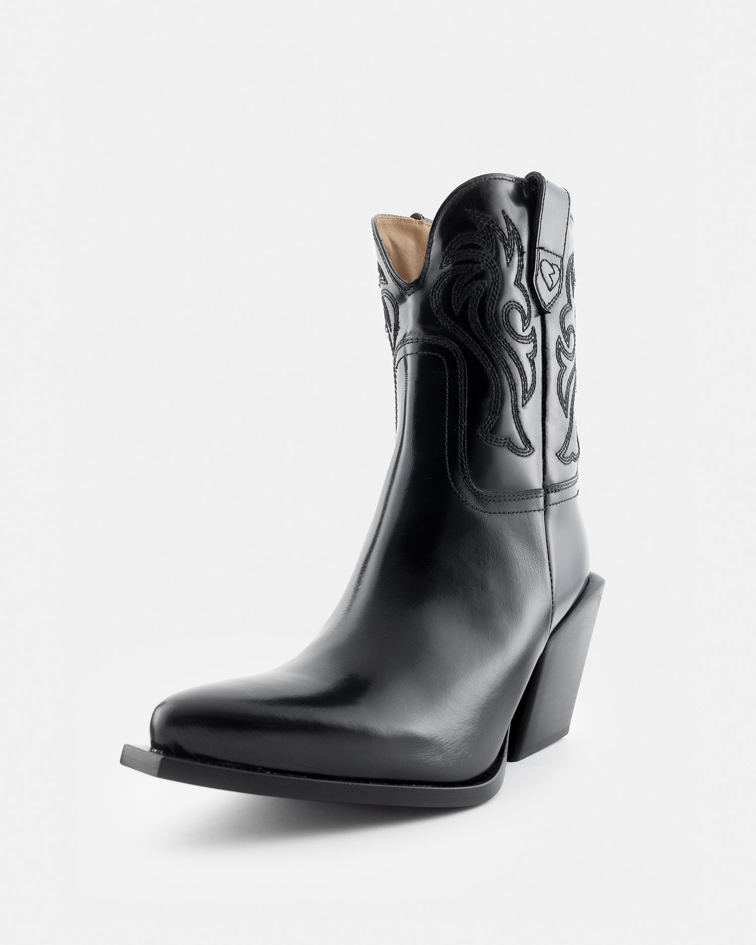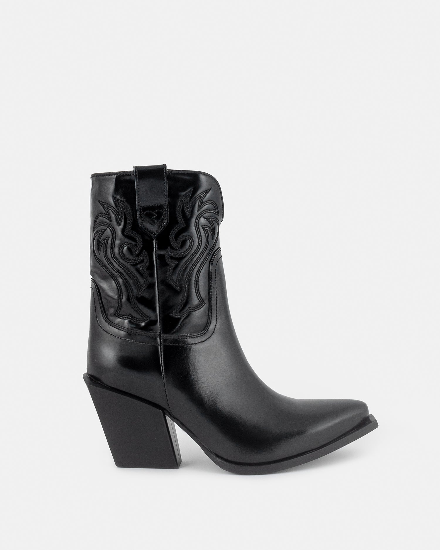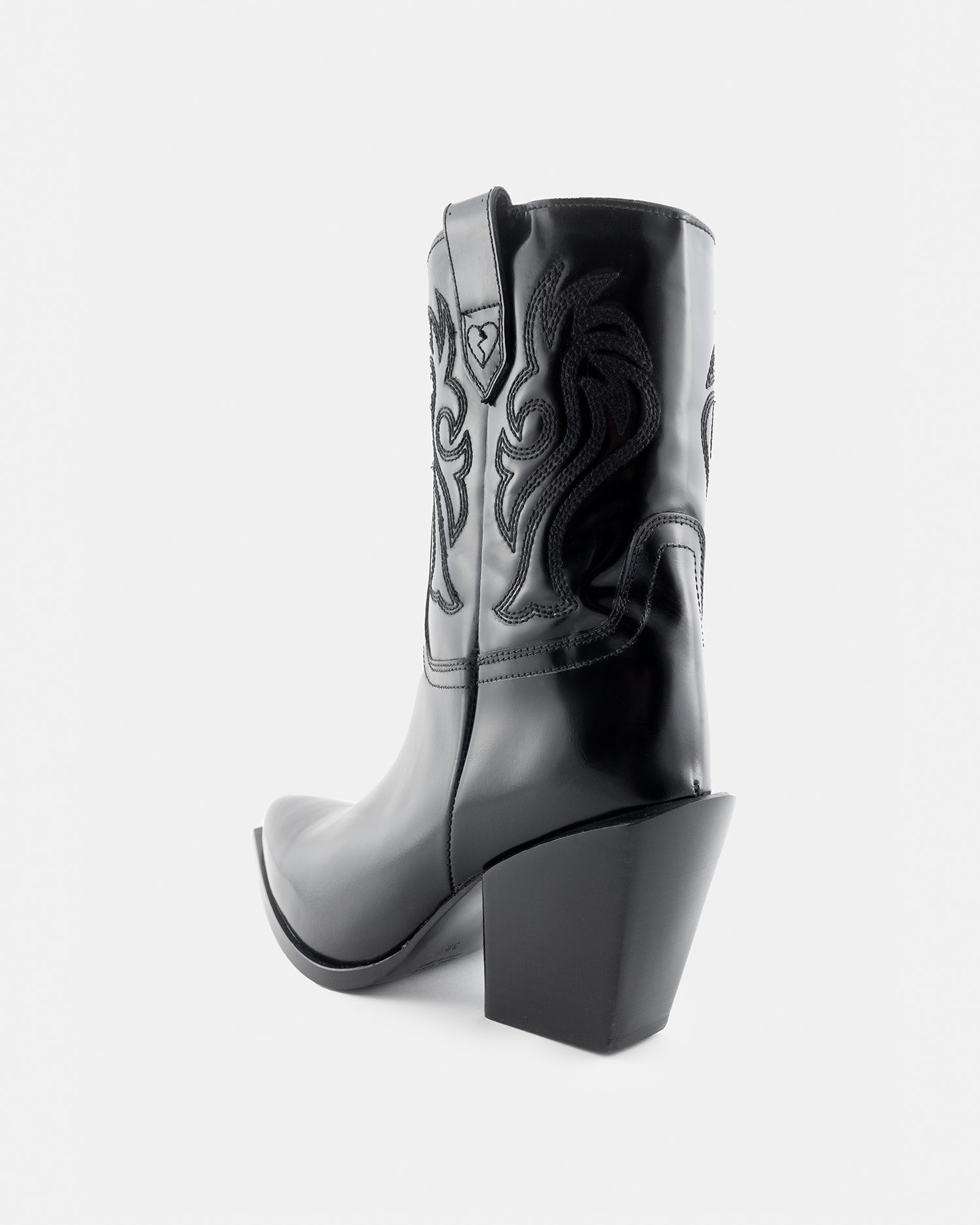 This Western-inspired pair is made from glossy black leather and set on the Netto's signature slanted Cuban heel. Detailed with tonal stitching and double-pull tabs for easy access. Super versatile, they look just as good teamed with denim as they do when paired with midi hemlines.