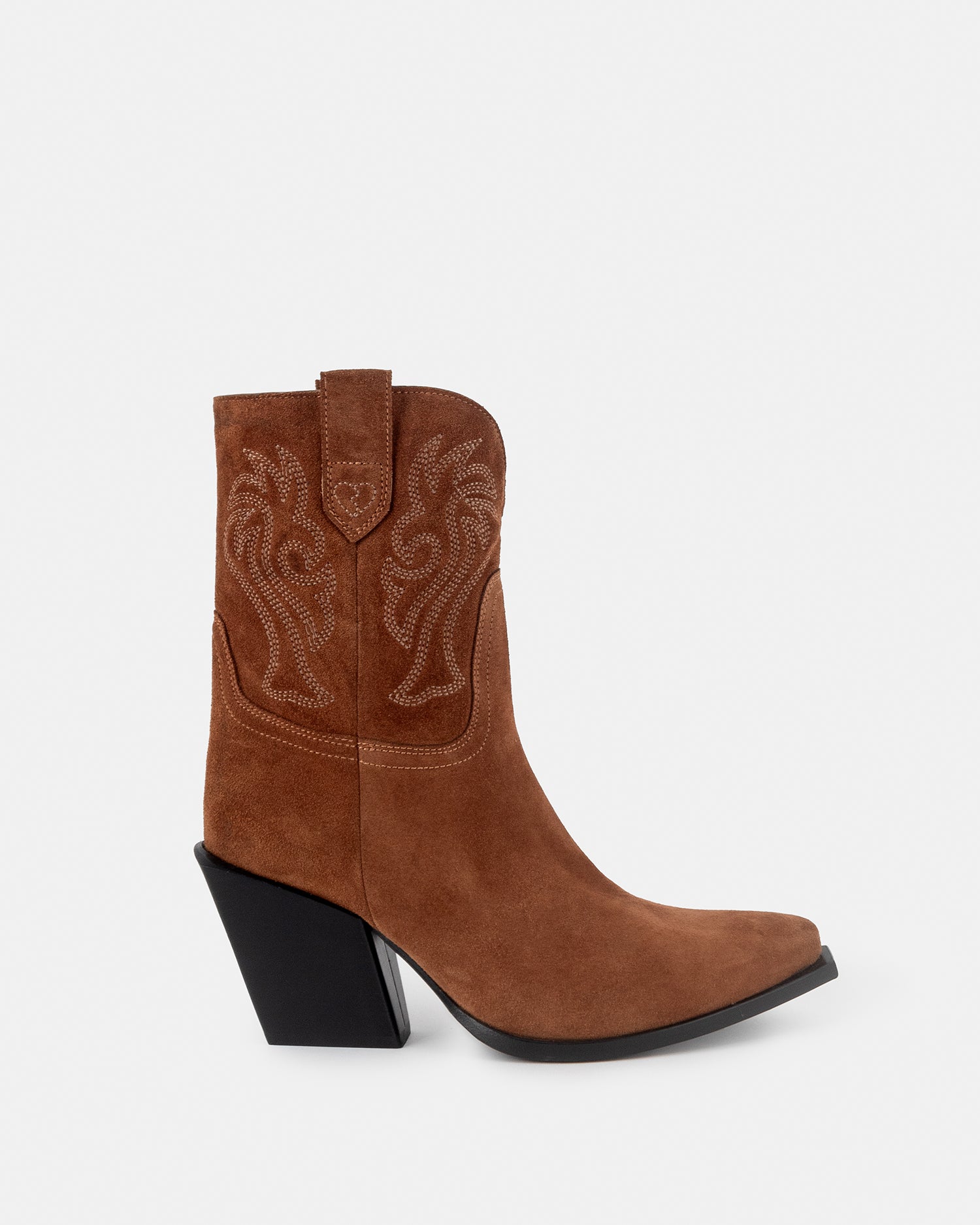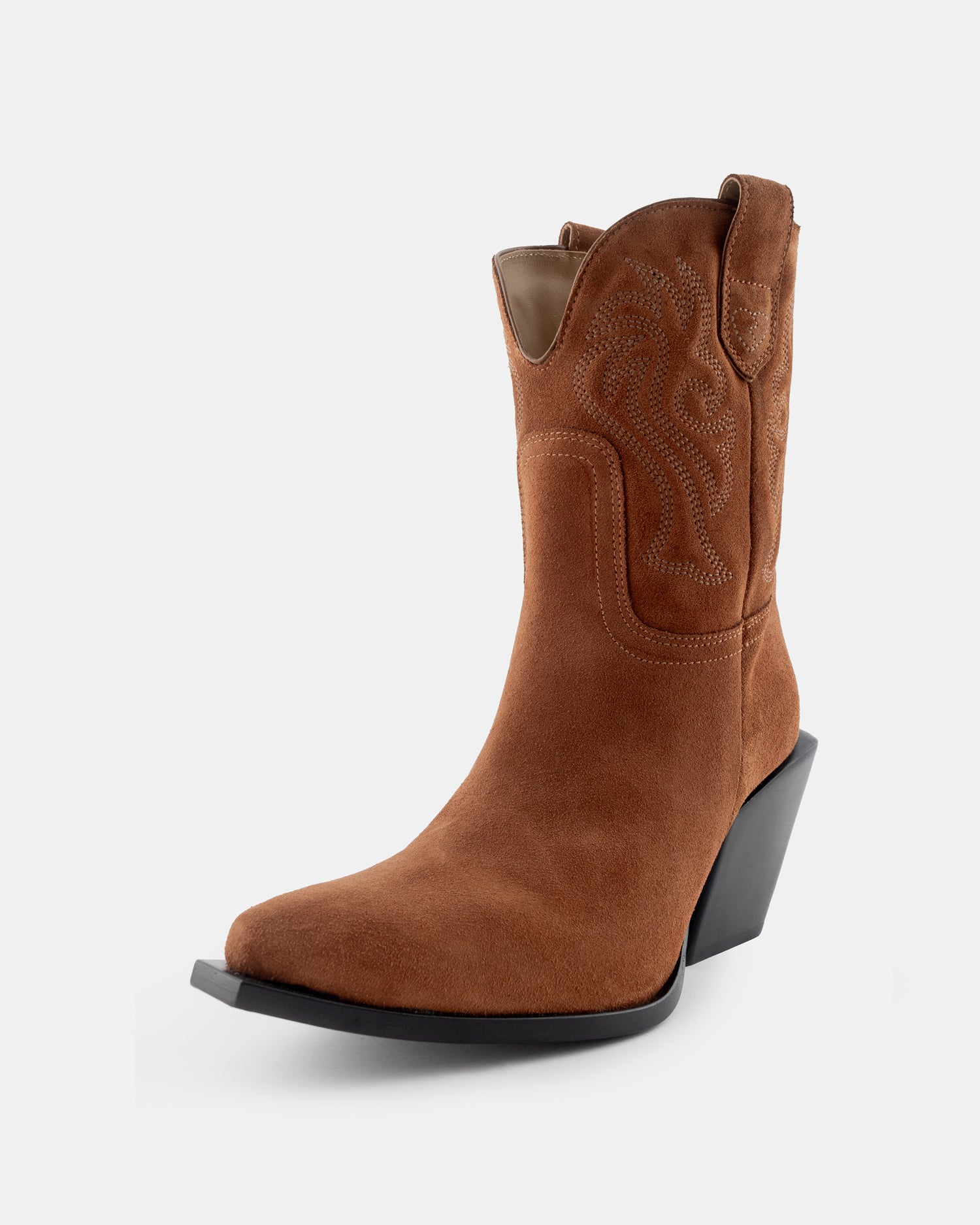 These sophisticated, western-inspired boots are made from plush tan suede and are sat upon the signature Netto slanted Cuban heel. Crafted with a careful stitch pattern and double-pull tabs that provide an easy fit. This versatile style easily transitions from denim looks to midi hemlines.